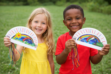 A paper plate, filling: plastic beads, un-popped corn or dried beans, multiple bright colors of curling ribbon, crayons or markers, scissors, and a stapler.