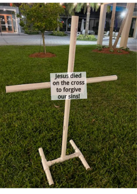 course place a large cross (see the cross, below). On a sheet of paper write in large letters "Jesus died on the