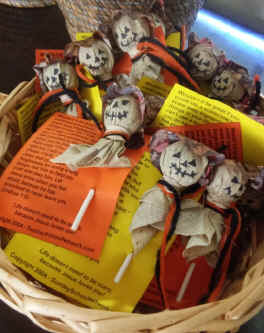 Directions: Place fabric over lollipop. Wrap a rubber band around the "neck" of the scarecrow to hold in place. Draw the eyes, nose and mouth using the black marker. Tie orange and black yarn around the neck of the scarecrow. Glue the round piece of green felt to the top of the lollipop to form the hat* (you can dip the top of the lollipop into the glue or hot glue a ring of glue around the lollipop to cover the sides, back and brow of the face). Punch a hole in the strip of paper. Tie the Bible verse to the neck of the scarecrow using another piece of yarn or attach the Scarecrow Lollipop to the Halloween tract, link below.